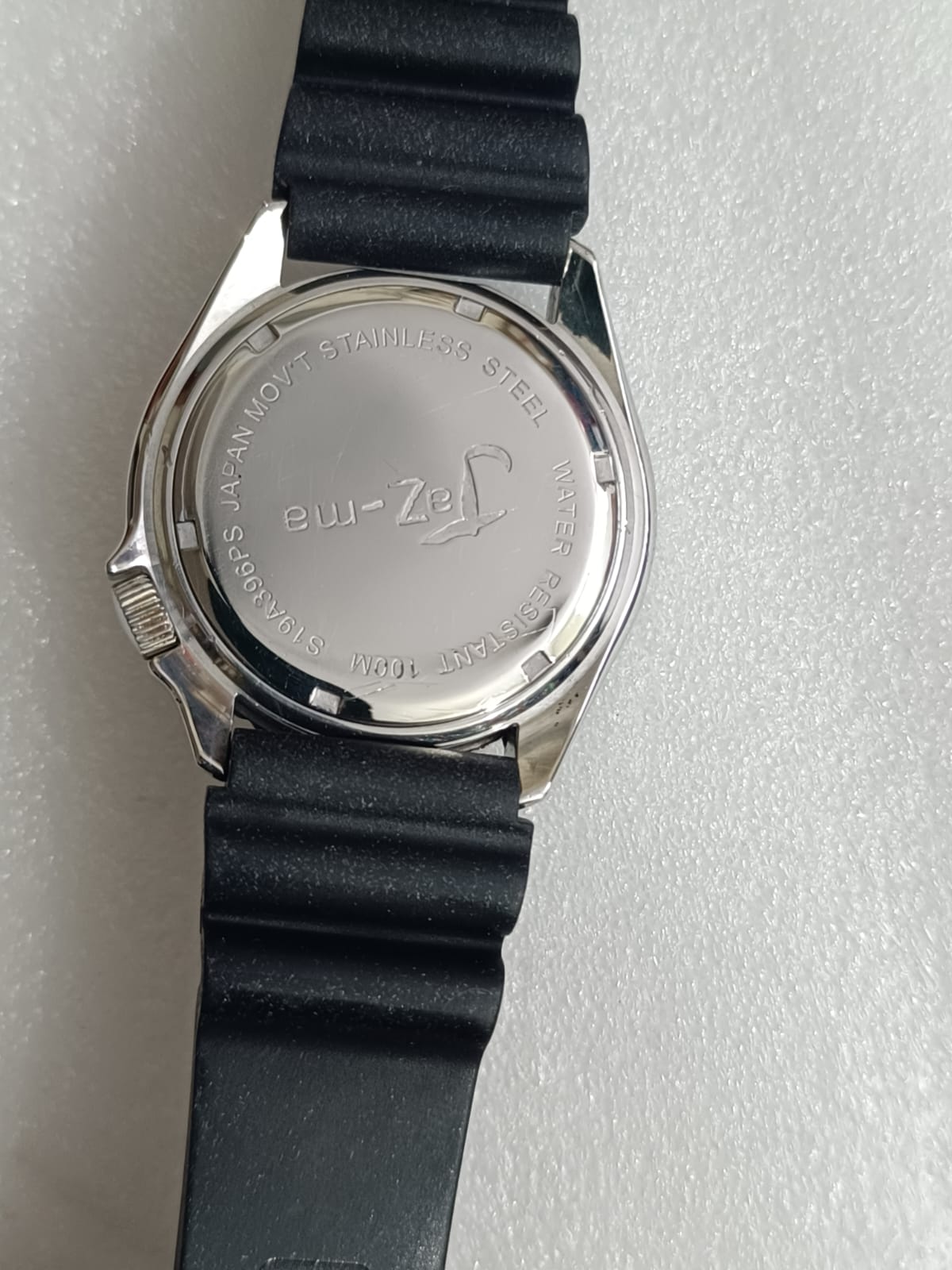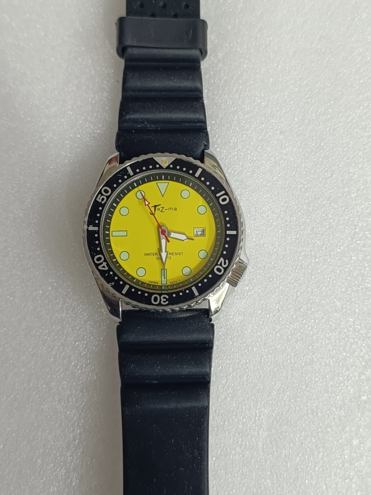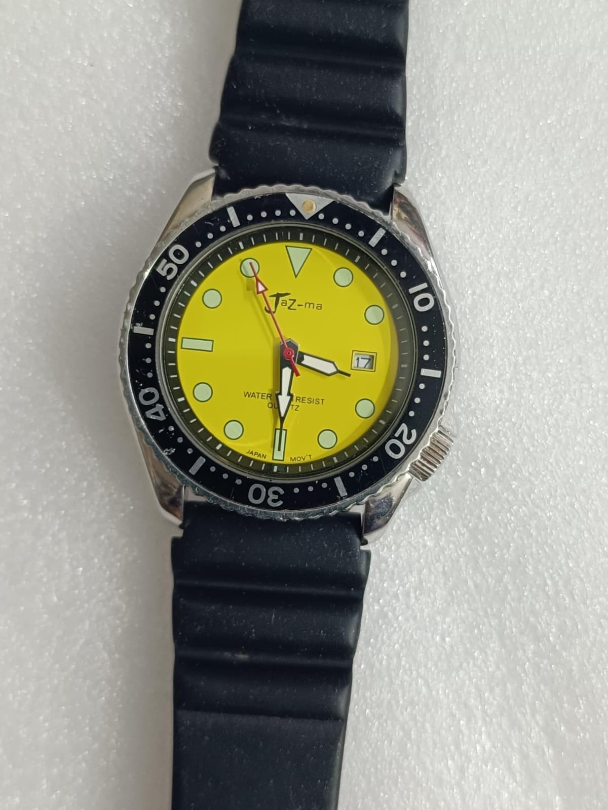 Japanese Micro Brand Jaz-ma Divers Quartz with beautiful yellow dial in working condition, Rotating Bezel, original rubber strap and Signed Buckle, Size 45mm including crown