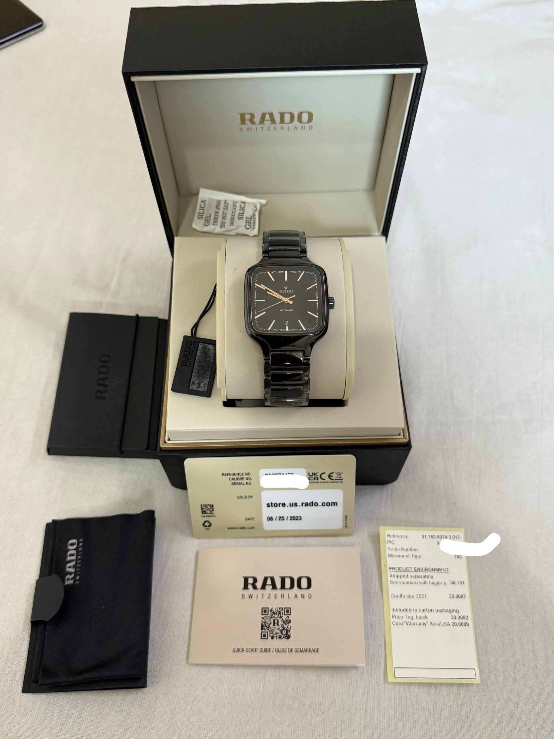 Full Set Unworn/Unsized BNIB piece with Invoice. Purchased from RADO Official US, Global Brand Warranty until August 2028. Elegant Black Ceramic 38mm case & bracelet with sleek 9.6mm width, can be dressed up or dressed down as per occasion.