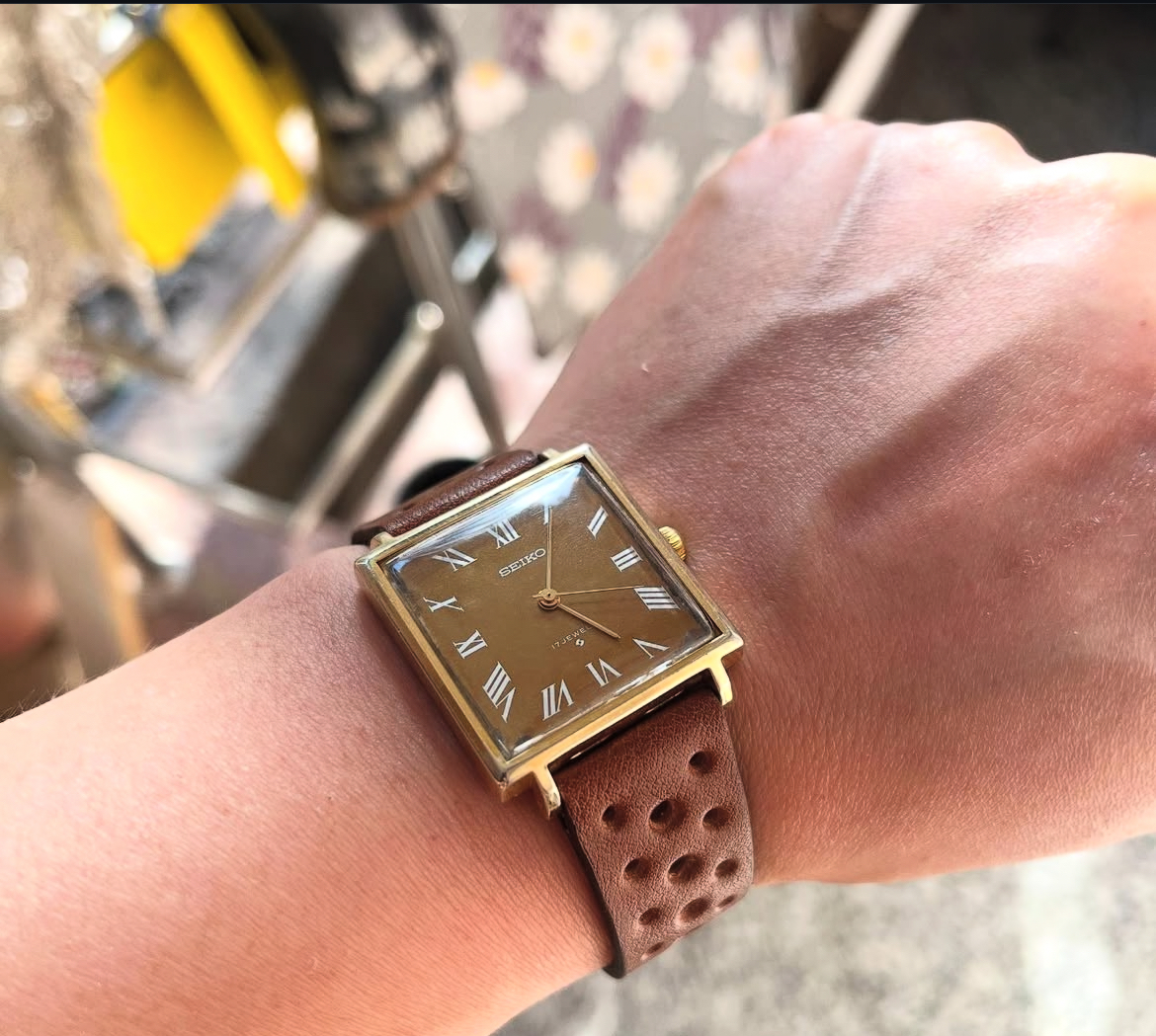 Rare seiko tank handwinding with beautiful sunburst roman dial and gold plated case with rally strap