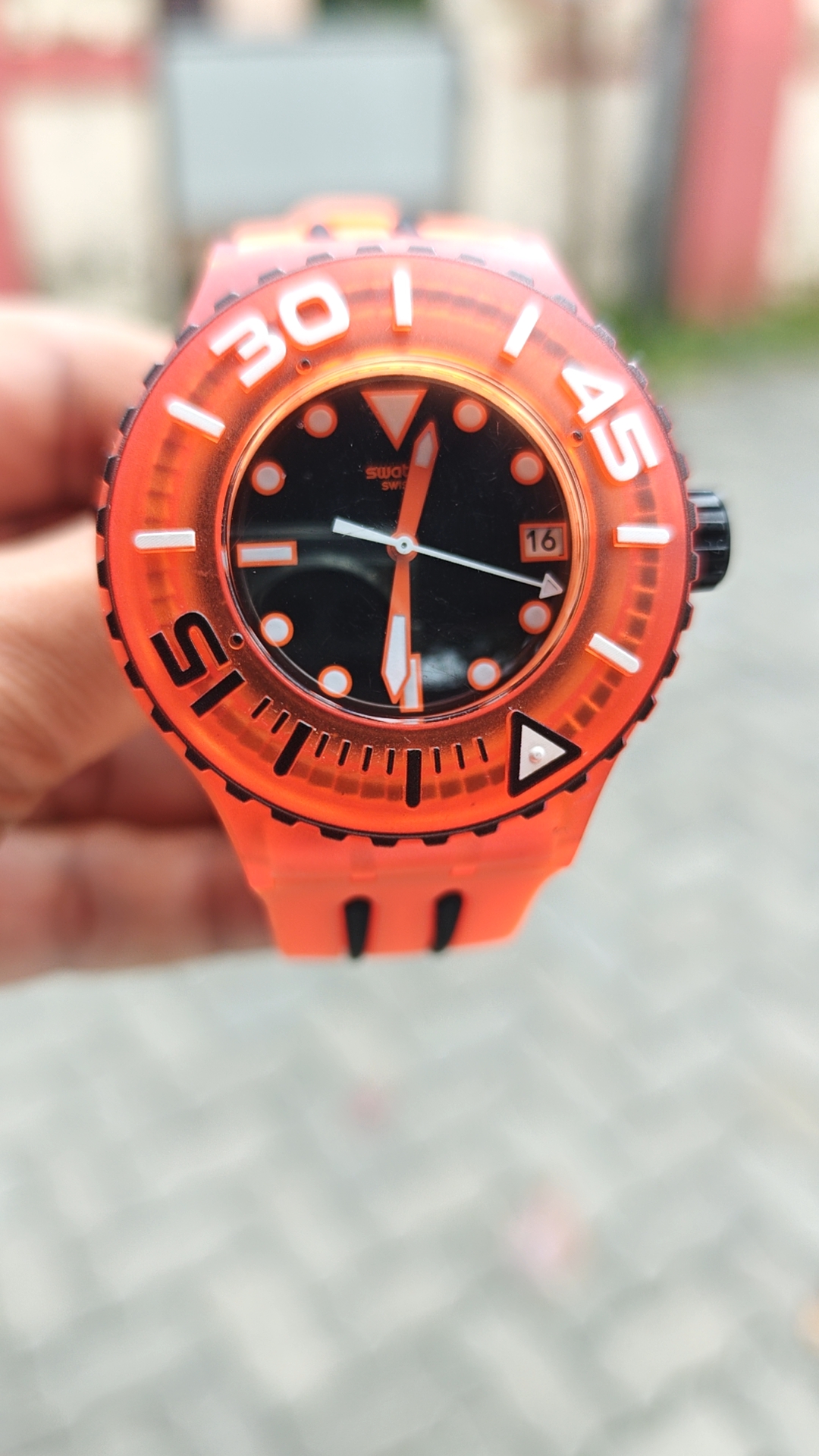 Perfect for any diving adventure is the Swatch Scuba Libere SUNDOWNER. Its color scheme is all orange with contrasting black. Individual white color accents on the rotating bezel and the black dial make it an eye-catcher on the arm. The waterproof watch is equipped with a rubber strap and a precision quartz movement with battery.