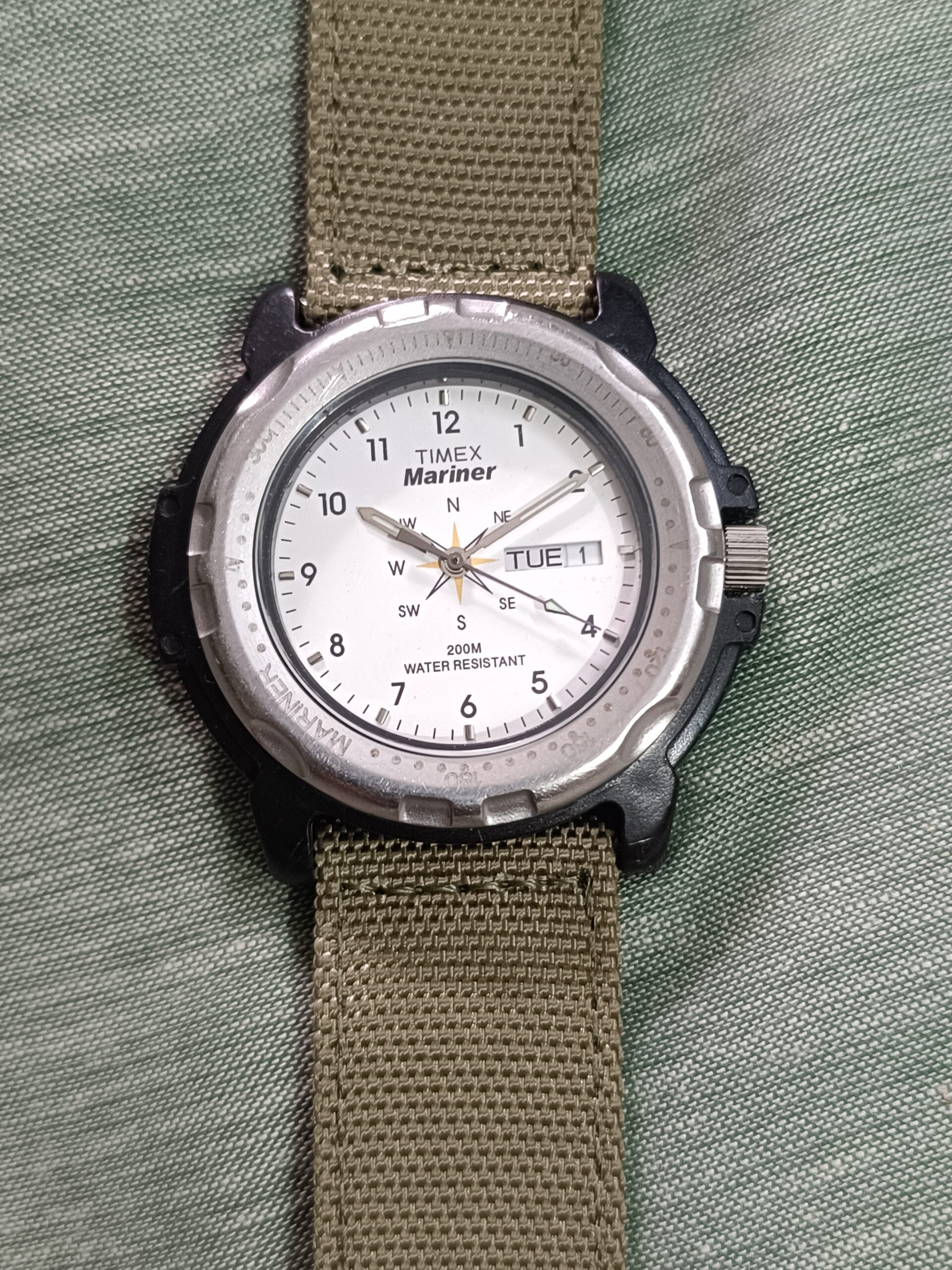 CompareTimex Mariner Quartz with beautiful White Dial in working condition Gent’s size,(Strap Buckle changed)