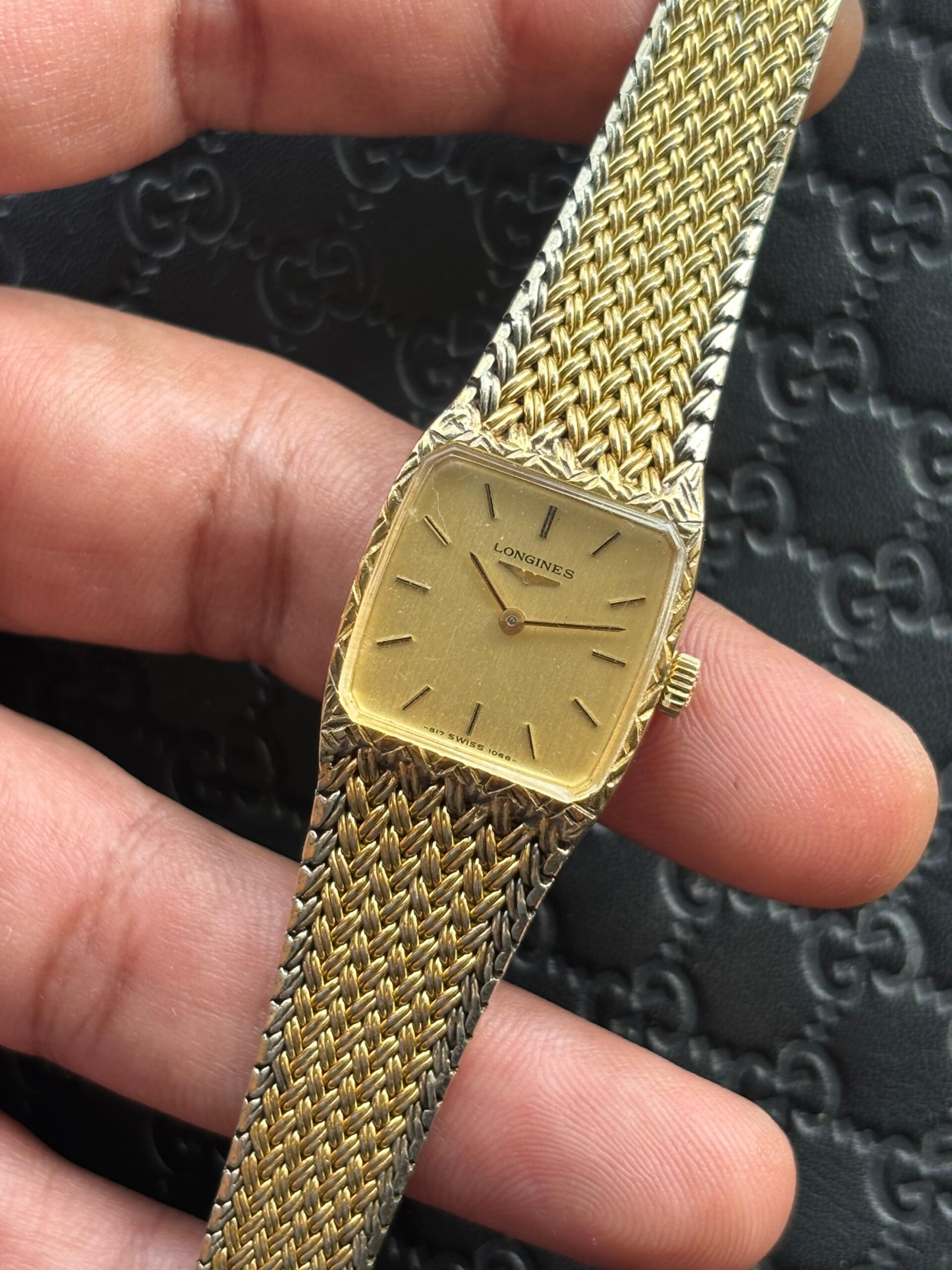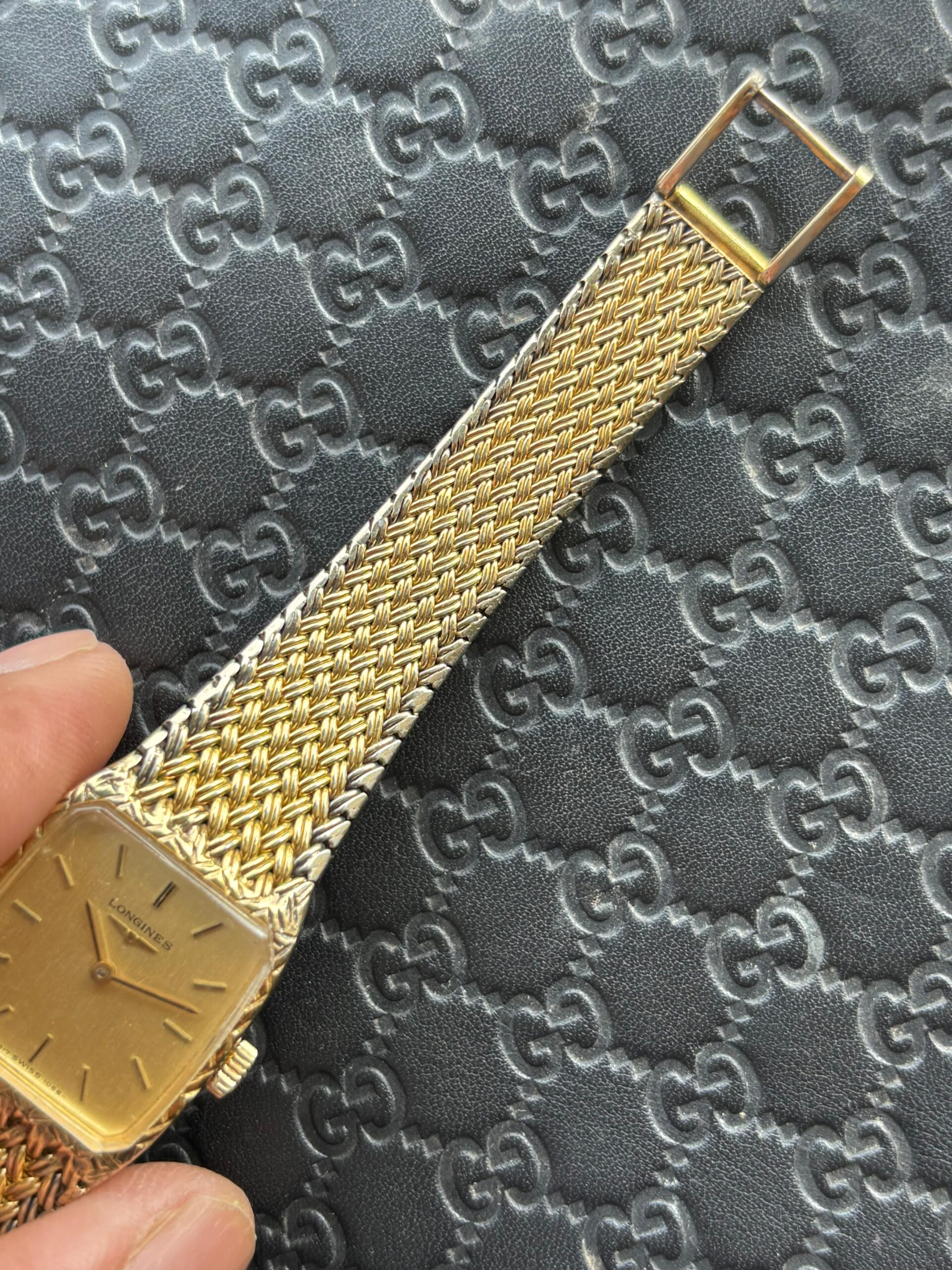 A gorgoues example of 1970s women’s Longines bracelet watch ! Rich is the word ! , extremely premium woven bracelet with art deco design on case , 21mm gold plated and silver 10 microns , original excellent dial , all signed parts , calibre L317 is very neat .